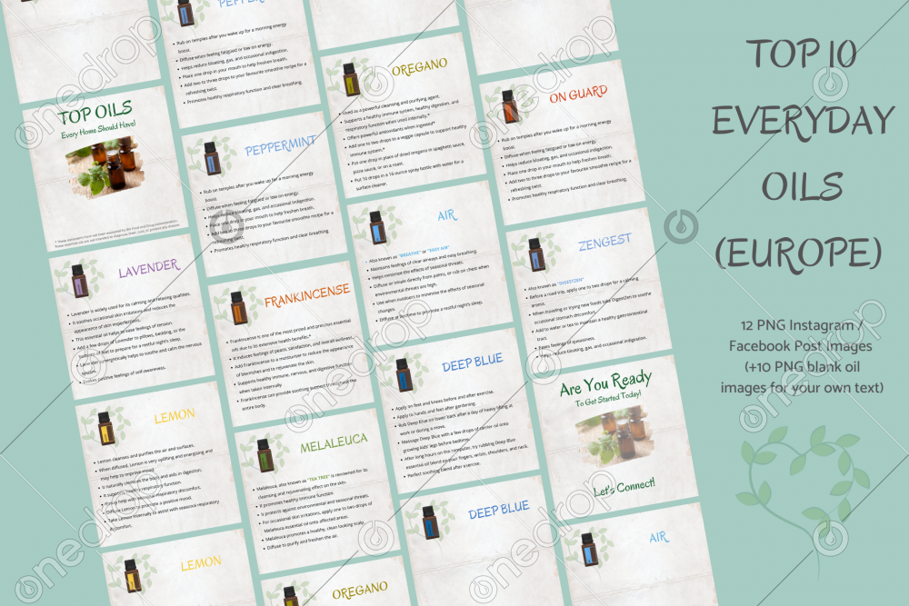 Top 10 Everyday Essential Oils (Europe) - Instagram/Facebook Posts 22 PNG Instagram / Facebook Post Images (1080 x 1080) Cover Images Top 10 Oils with main benefits - Lavender, Lemon, Peppermint, Frankincense, Melaleuca, Oregano, Air, Deep Blue, On Guard, ZenGest (with referral to other names if applicable). Top 10 Oils Image only for your own text Call To Action *Space for logo on cover and call to actions post, along with space for copyright info at the bottom of each image.