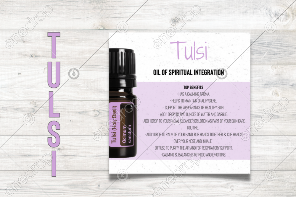 Square infographic with benefits & usage tips of Tulsi Essential Oil.