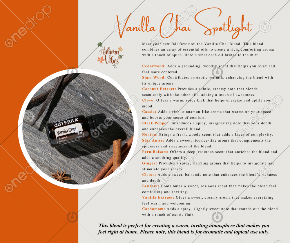 ☕ Vanilla Chai in the Spotlight ☕ Say hello to your new fall obsession: the Vanilla Chai Blend! 🍁 This delightful mix of essential oils brings together rich, comforting aromas with just the right touch of spice. Here’s what each oil brings to the party: