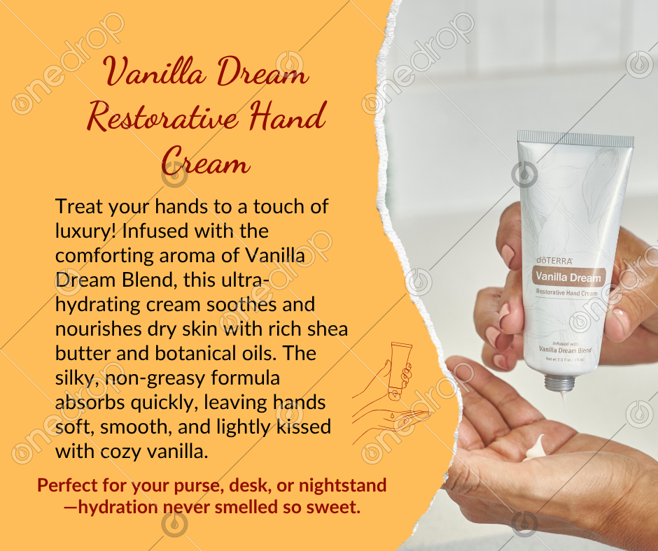 Wrap your hands in a dreamy hug! 💛 Vanilla Dream Restorative Hand Cream nourishes and hydrates with a rich, non-greasy formula, leaving your skin soft and silky. Infused with the comforting Vanilla Dream Blend, it’s a little daily indulgence for smooth, happy hands—perfect at home or on the go.
