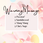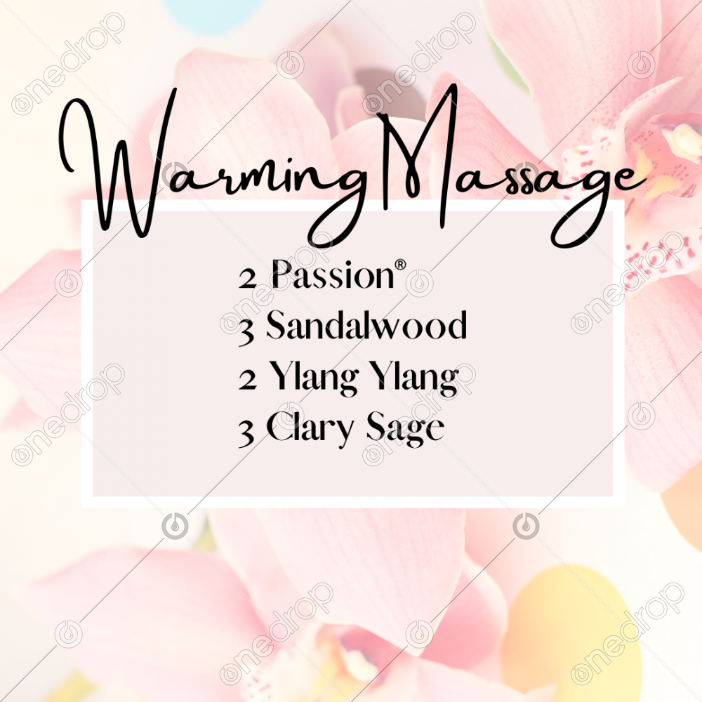 Square post listing the oils Passion, Sandalwood, Ylang Ylang and Clary Sage to mix with a carrier oil and make an incredible warming massage oil.