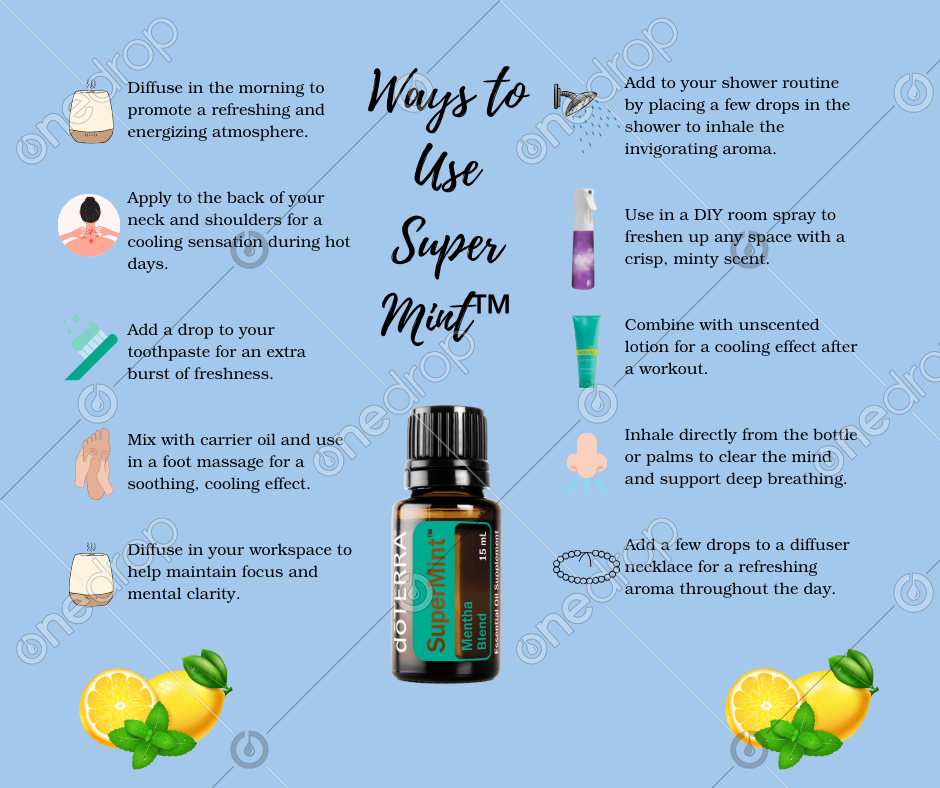 Ways to Use SuperMint – SuperMint is your go-to for a refreshing and invigorating experience! Whether diffusing it in the morning to jumpstart your day, adding it to your shower for an energizing boost, or mixing it into your post-workout routine for a cooling effect, SuperMint's crisp, minty scent revitalizes both body and mind. From enhancing your focus at work to providing a soothing foot massage, this versatile oil brings a burst of freshness to every moment, helping you stay cool, clear, and collected all day long.