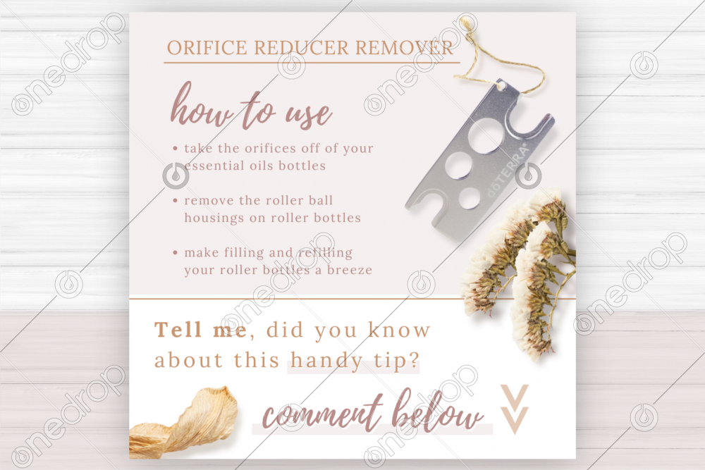 - Soft, white and light dusty rose background with flat-lay dried flowers and an image of a silver dōTERRA Orifice Reducer Remover