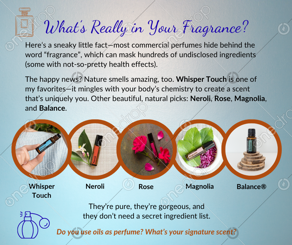 The happy news? Nature smells amazing, too. 🌿 Whisper Touch is one of my favorites—it mingles with your body’s chemistry to create a scent that’s uniquely you. Other beautiful, natural picks: Neroli, Rose, Magnolia, and Balance.
