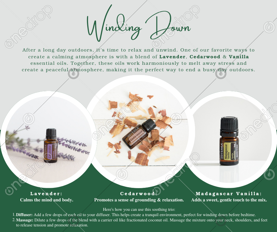 After a long day outdoors, it's time to relax and unwind. One of our favorite ways to create a calming atmosphere is by using a blend of Lavender, Cedarwood, and Vanilla essential oils.