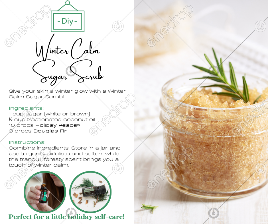Give your skin a winter glow with a Winter Calm Sugar Scrub! 🍃❄️ Combine 1 cup sugar, ½ cup coconut oil, 10 drops Holiday Peace®, and 3 drops Douglas Fir. Store in a jar and use to gently exfoliate and soften, while the tranquil, foresty scent brings you a touch of winter calm. Perfect for a little holiday self-care! 🌲💆♀️