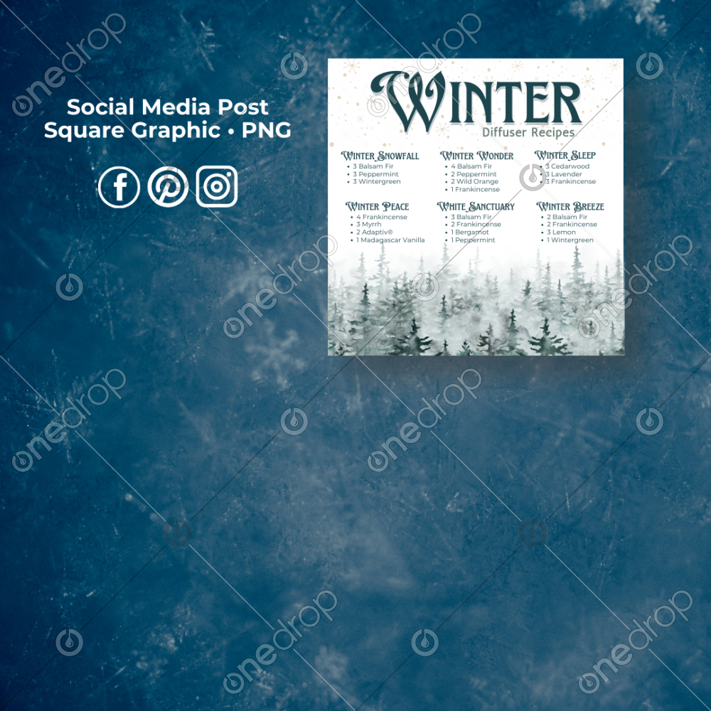 Square graphic 1080x1080 with Winter Diffuser Recipes Winter theme Perfect to share with customers or post for a quick overview Social media posts Blog post images eBooks Pintrest pins Instagram Stories Facebook Stories Texting WhatsApp