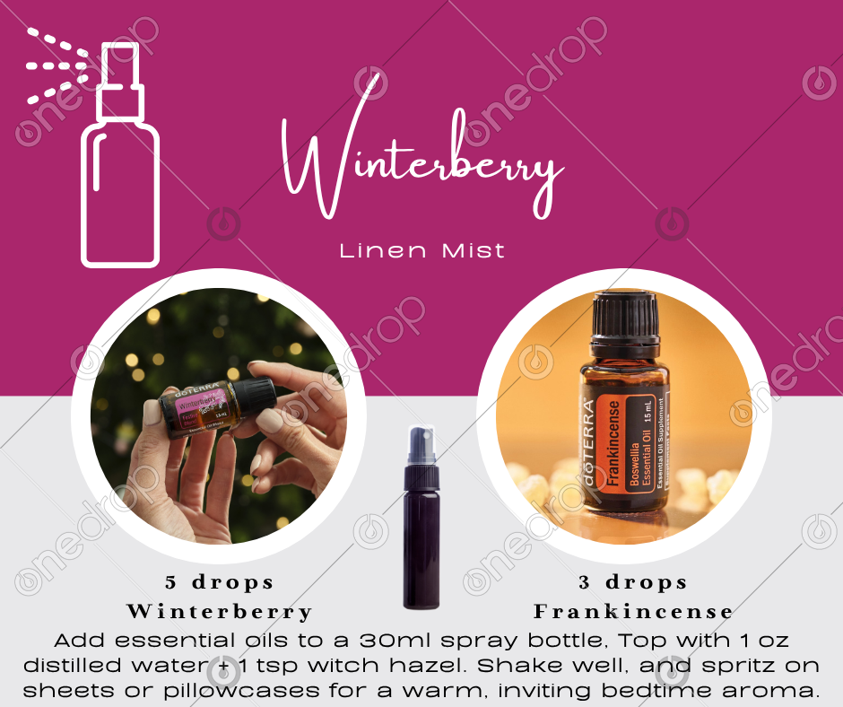Tuck yourself into a cloud of cozy! Combine 5 drops Winterberry, 3 drops Frankincense, 1 oz distilled water, and a splash of witch hazel. Spritz over your sheets and pillowcases for a warm, comforting scent that whispers “sweet dreams ahead.” 💫
