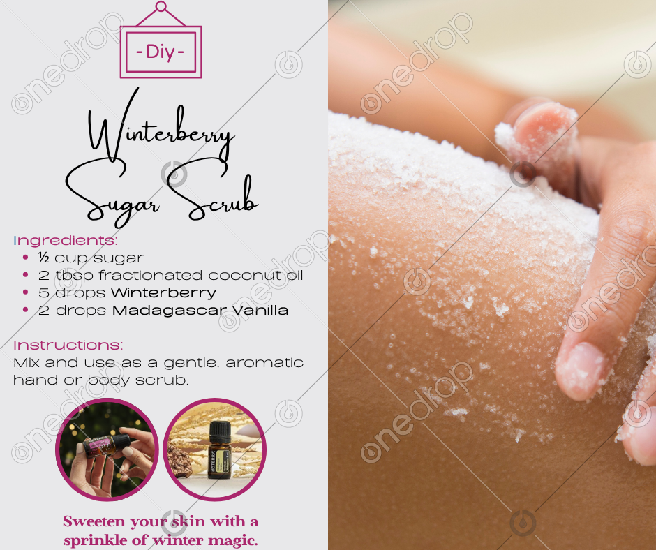 Scoop up a little sparkle for your skin! Combine ½ cup sugar, 2 tbsp Fractionated Coconut Oil, 5 drops Winterberry, and 2 drops Madagascar Vanilla . Massage gently for soft, glowing skin that smells like holiday bliss. 🎄💫