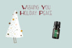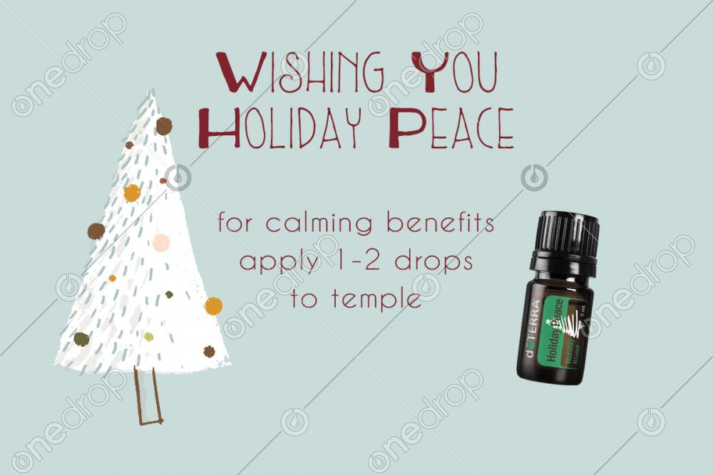 A festive greeting featuring a 5 ml. bottle of Holiday Peace essential oil. One image has text and a second image is without text to allow space for a personal promo, recipe, etc. The graphic also includes a simple holiday tree.