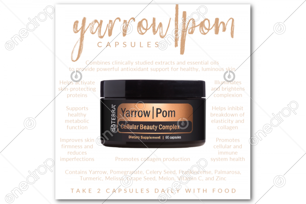 This square graphic features key benefits and usage instructions for Yarrow|Pom Capsules. A wonderful way to help maintain skin's youthful appearance and promote collagen production from the inside out.