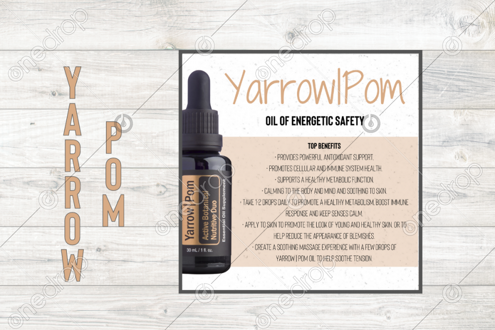 Square infographic with benefits & usage tips of Yarrow|Pom Essential Oil.