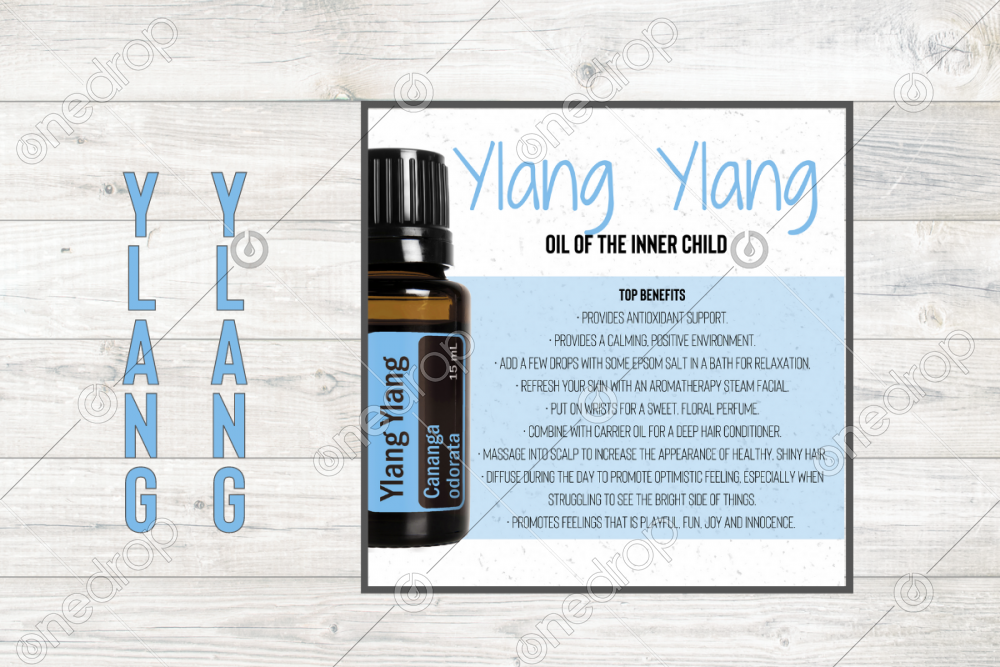 Square infographic with benefits & usage tips of Ylang Ylang Essential Oil.