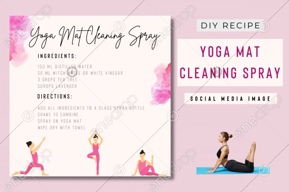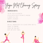 A pretty pink social media image featuring a DIY recipe for a yoga mat cleaning spray, as well as some yogi graphics.