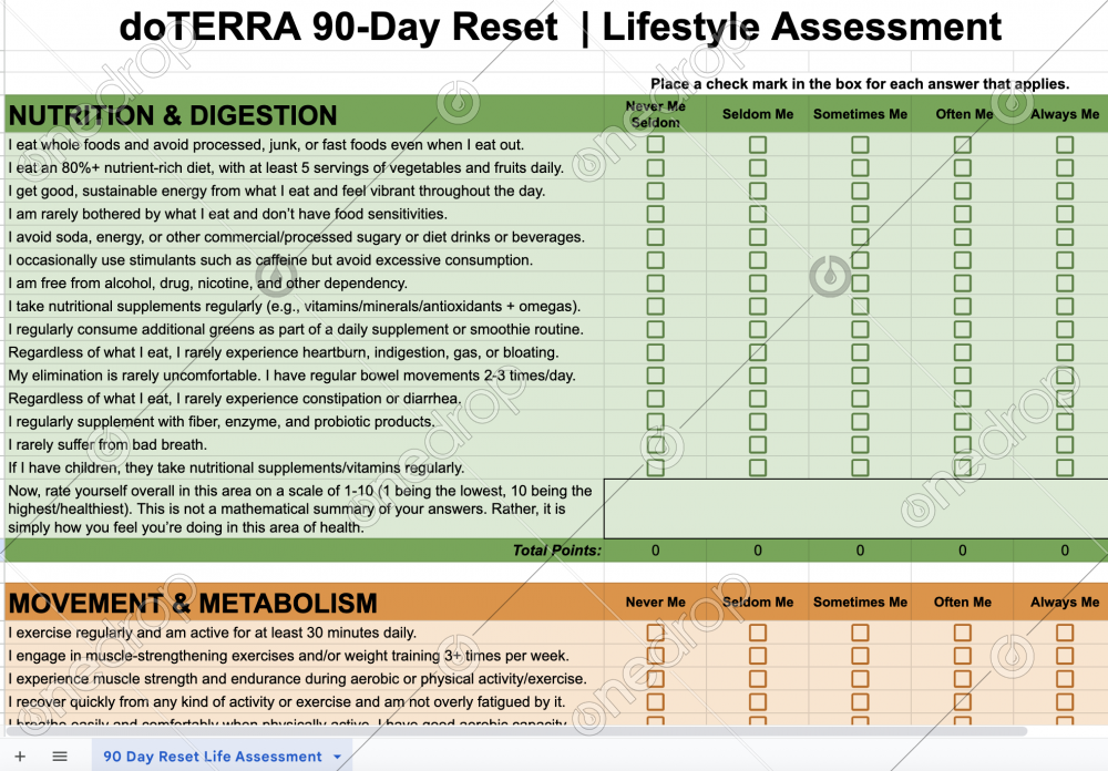 Here's a Google Sheet for the 90 Day Reset Initial Assessment.